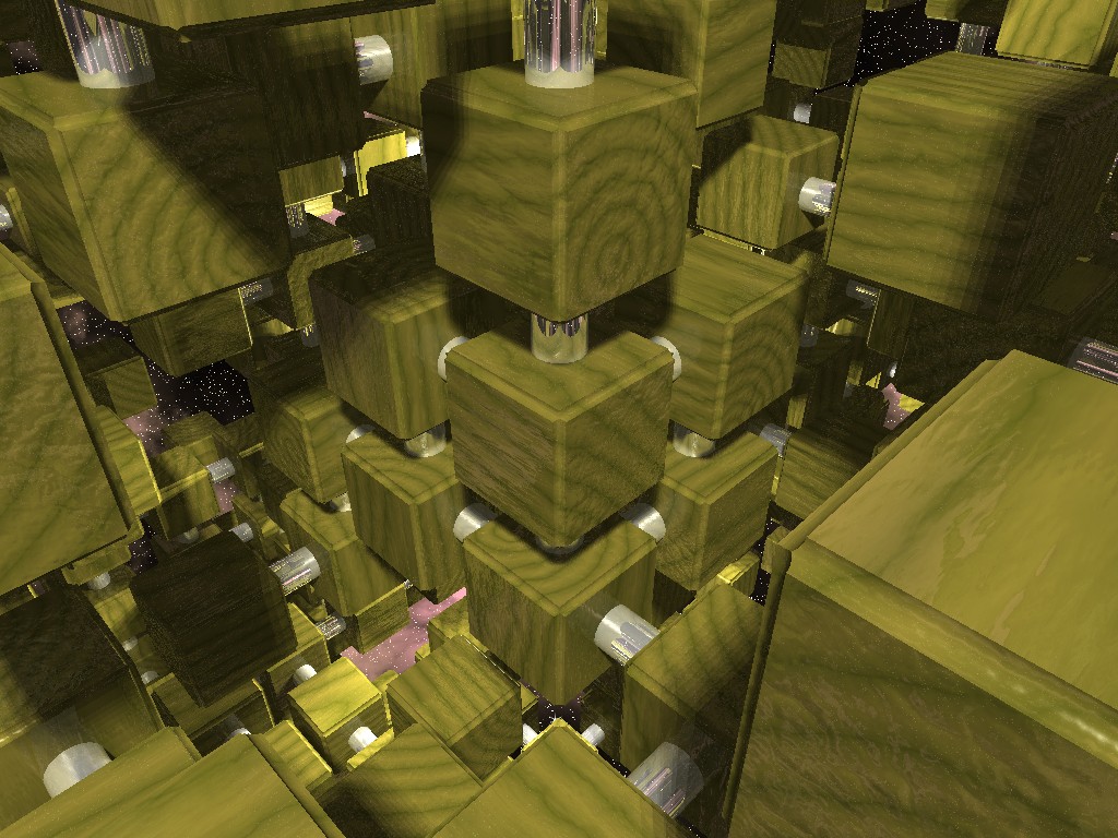 wooden cubes connected with chrome pipes are doing floating around in
