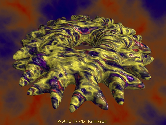 > > This time the blob only contains 12 positive sphere> components (scaled).> > (The "Just another blob" image contained 18.)> > The background is now faded down as Christoph> Hormann suggested.> > On another version oft his image I also tried to add> a normal that makes the yellow (that was green> before) seem like it sticks on top of the object's> surface (also suggested by Christoph Hormann).> > But I didn't succeeded in doing so :(> > Is it not possible to use the granite keyword within> a normal {} statement ?> > Tor Olav> --> mailto:tor### [at] hotmailcom> http://www.crosswinds.net/~tok/tokrays.html> > ----------------------------------------------------------------------> [Image]
