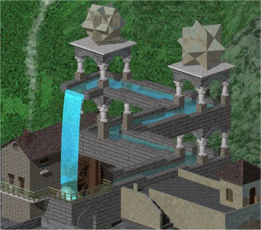 > While not up to the caliber of the other work I've seen posted here,> I thought I'd share for this image I did. It is based on M.C.> Escher's "Waterfall".