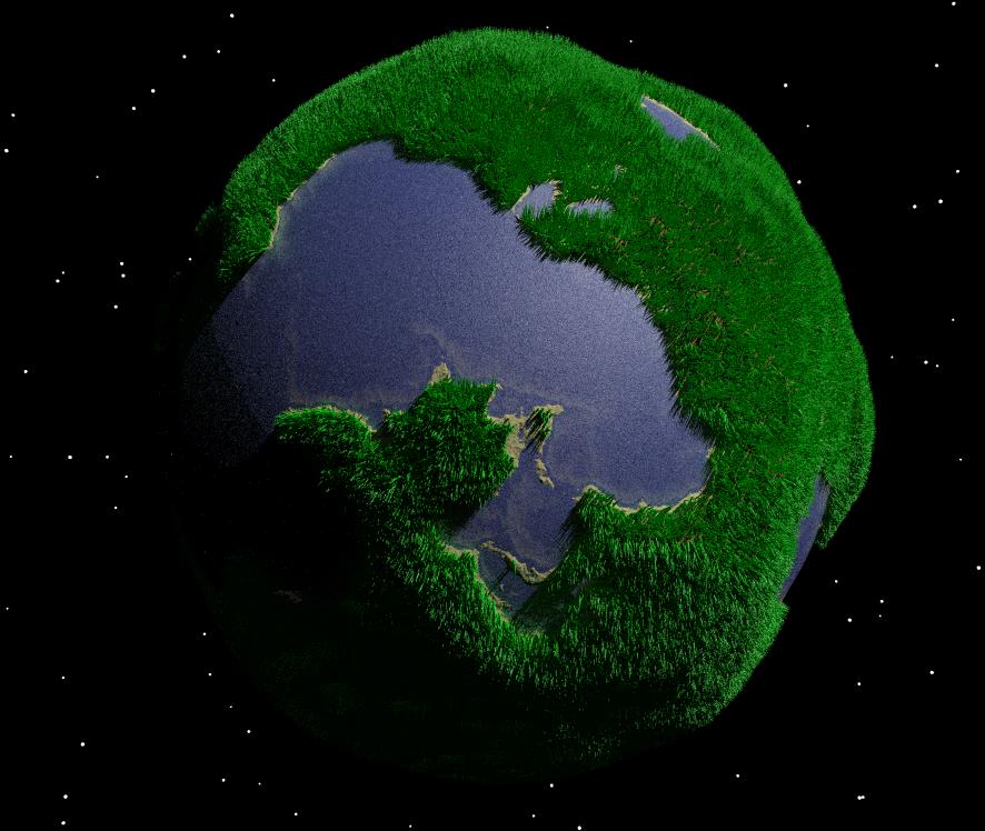 The planet is an isosurface, and grass a bunch of some 300000 cones.