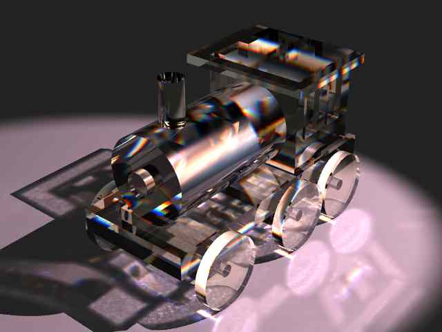 > This is a crystal train using dispersion, variable reflection & photons. I> based this on a tiny wooden train engine that came packaged with a box of> Japanese candy.