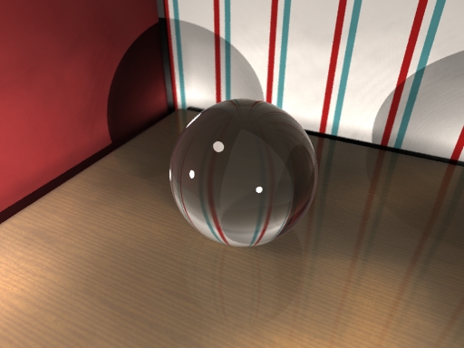 > A glass sphere on a wood table with photons and focal blur.