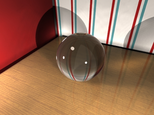 A glass sphere on a wood table with photons and focal blur.
