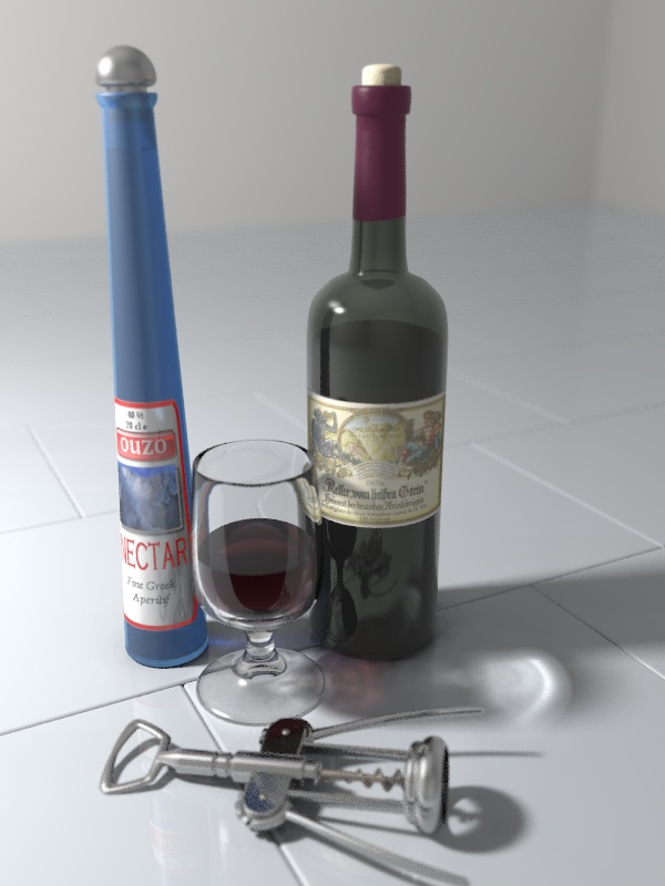 a photograph are the highlights on the bottles and corkscrew.