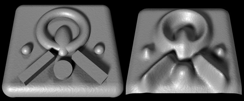 The right object is a traced and blurred heightfield, done with my macros.