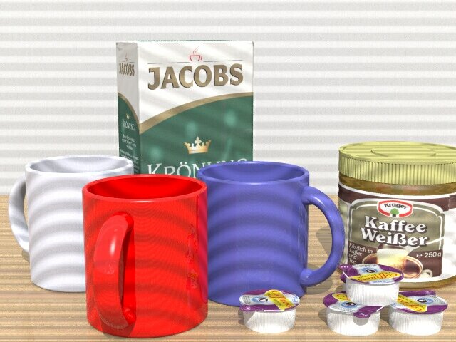 The scene uses image maps for the coffee and cream packages. My mug texture