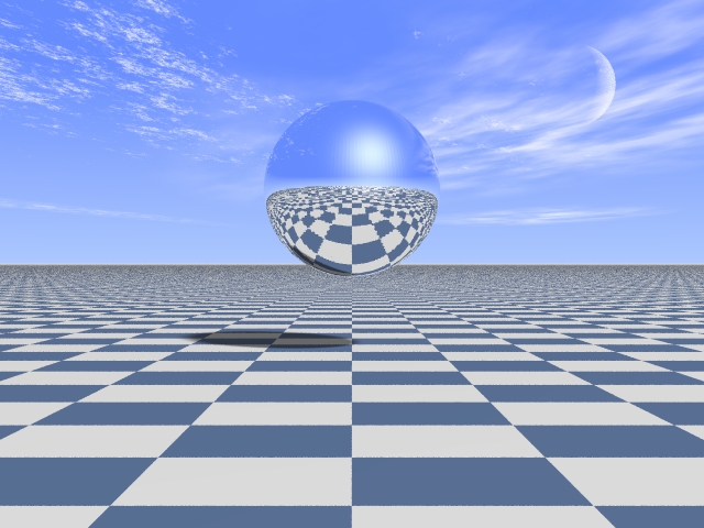 > a reflective mesh sphere above a checkered plane> > >
