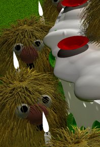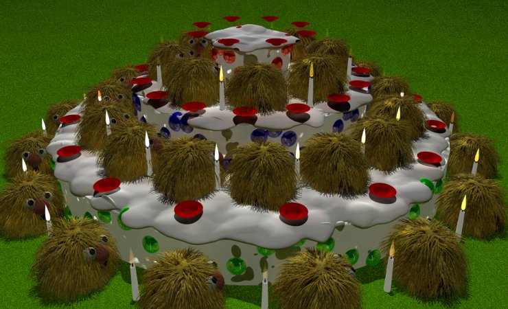 The pov-cake with monsters was rendered using radiosity. Near each candle is