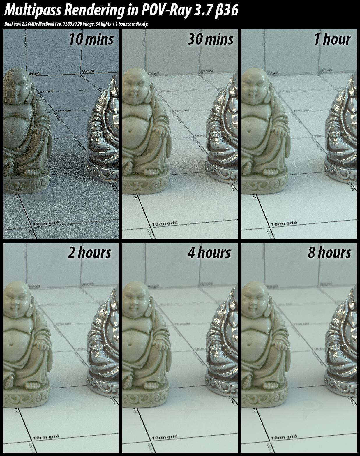 Everything was rendered on my 2.26MHz MacBook Pro in the 64-bit bui;d of POV-Ray