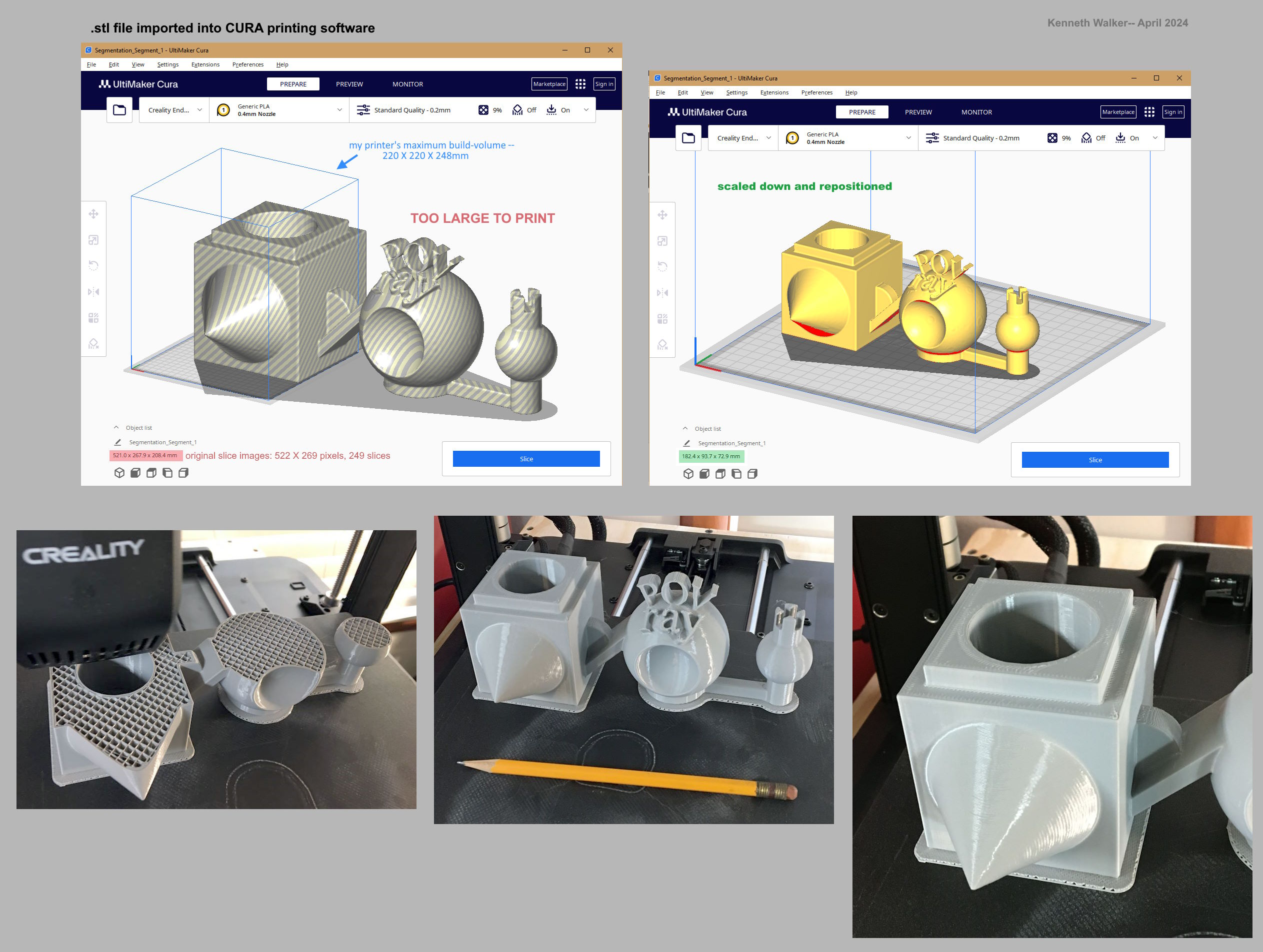 [importing the .stl file into CURA, and printing the final model]